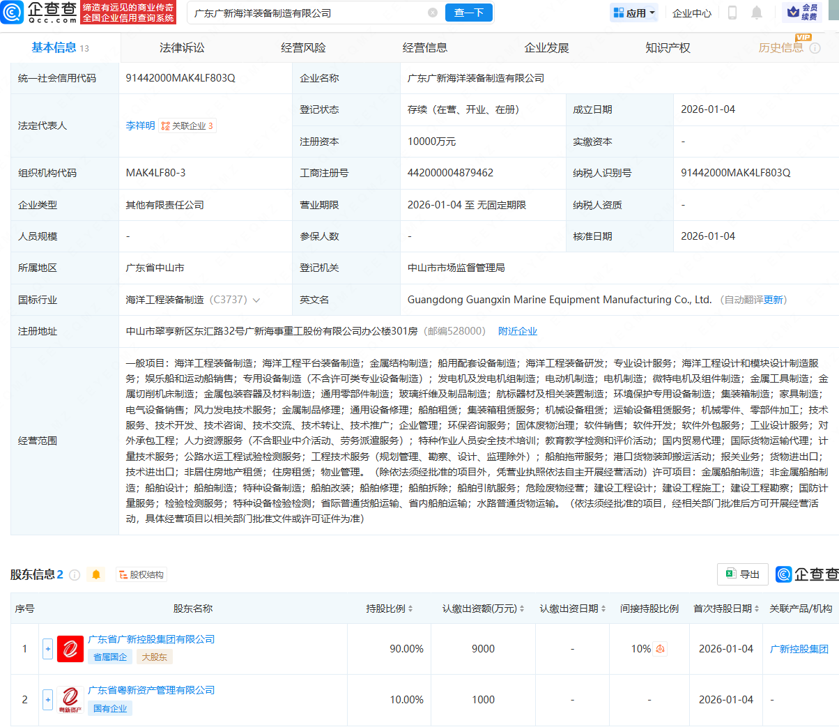 近日,广东广新海洋装备制造有限公司成立,法定代表人为李祥明,注册资本为1亿元,经营范围包含:海洋工程装备制造;海洋工程平台装备制造;金属结构制造;船用配套设备制造;海洋工程装备研发等。企查查股权穿透显示,该公司由广东省广新控股集团有限公司、广东省粤新资产管理有限公司共同持股。